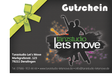 Sie suchen noch ein besonderes Geschenk zu Weihnachten?Schenken Sie Lebensfreude und Spaß mit einem Gutschein in beliebiger Höhe z.B. für eine Privatstunde, einen Tanzkurs, eine Clubmitgliedschaft im Tanzstudio Let's Move oder ein Weinseminar mit Esther. Sie können Gutscheine entweder telefonisch oder direkt online auf unserer Website bestellen. Wir senden Ihnen auf Wunsch den Gutschein per Post zu. | |||